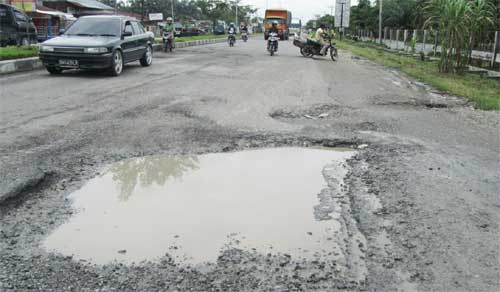 BANDAR LAMPUNG – Beberapa ruas jalan dari Tegineneng – Sukadana melewati Kota Metro tampak berlubang, diduga sebagai akibat pengalihan rute lalu lintas pasca ambrolnya Jembatan Lempuyang Bandar, Lampung Tengah akhir bulan Januari lalu. Menanggapi hal itu, anggota Komisi V DPR RI dari Lampung K.H. Abdul Hakim langsung menghubungi Direktur Jenderal Bina Marga Kementerian Pekerjaan Umum (PU), Djoko Murjanto, melalui telepon seluler (17/3) mengabarkan ruas jalan nasional yang rusak tersebut.