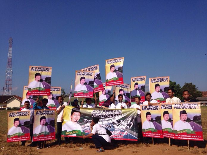 Seperti ahad sore ini (28/6) jelang waktu berbuka puasa di pinggir jalan Gedong Tataan pasukan SAY dengan wajah penuh semangat dan percaya diri berdiri memegang banner kecil ukuran sedang dan spanduk sosialisasi nama dan wajah Almuzzammil Yusuf serta jargonya Ayo Perbaiki Pesawaran!.