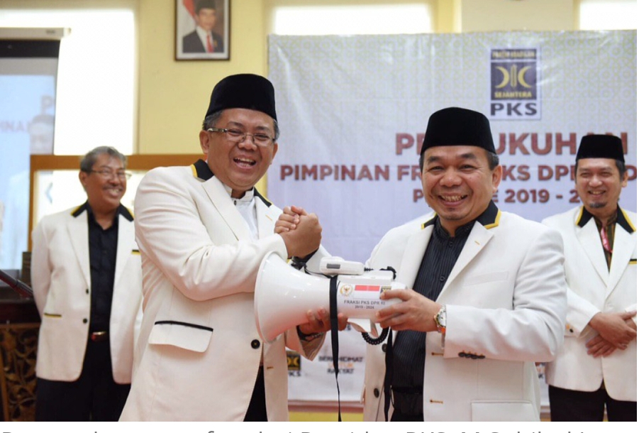 Jakarta (30/09) — Presiden Partai Keadilan Sejahtera (PKS), Mohamad Sohibul Iman serahkan megafon dan pulpen kepada ketua Fraksi PKS di DPR RI dan MPR RI di Aula Gedung DPP PKS, Jakarta Selatan, Senin (30/09/2019).